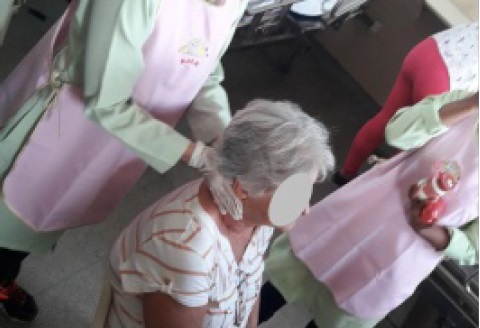 Cuidado Físico - Este cuidado era composto de materiais que possibilitassem a essa família o cuidado do corpo, tais como: massagem relaxante, alongamento, cuidados estéticos não invasivos ou outros viáveis que poderiam ser sugeridos pelo familiar. O familiar escolheu a massagem relaxante, pois estava cansado e tenso devido ao fato de também não ter dormido bem à noite. Logo após o cuidado, afirmou se sentir bem melhor.