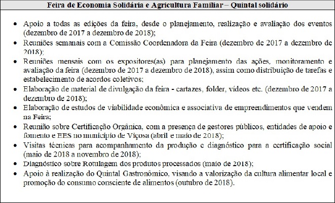 De forma específica, as principais atividades realizadas junto à Feira de Economia Solidária e Agricultura Familiar - Quintal Solidário foram de planejamento, organização dos expositores, gestão e avaliação dos eventos. A equipe dedicou-se a apoiar cada edição, contribuindo para a promoção de atividades culturais, divulgação, realização de oficinas e gestão do espaço. As reuniões com os(as) expositores(as) serviram para a definição de responsabilidades e acordos coletivos, fortalecimento de identidade, proposição de novas ações e tomadas de decisão.