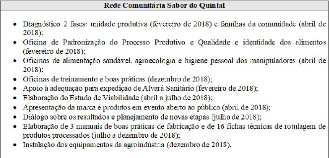O objetivo foi desenvolver um processo que subsidiasse a unidade de referência para processamento e inserção no mercado de alimentos fabricados a partir da matéria prima da própria comunidade. Buscou-se a elaboração de produtos de frutas que tivessem uma identidade comunitária e agroecológica, aproveitando alimentos de época e locais, valorizando a diversificação produtiva e incentivando o manejo e transição agroecológica. Apresentamos as principais atividades realizadas no quadro a seguir: