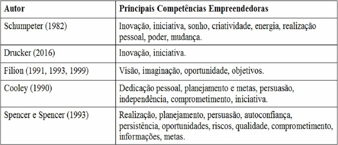 As competências empreendedoras são descritas por diversos autores, conforme apresentado no Quadro 1: