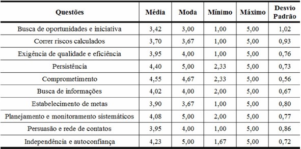 Os resultados desta pesquisa são apresentados a partir da estatística descritiva das questões referentes às competências empreendedoras, conforme Tabela 1.