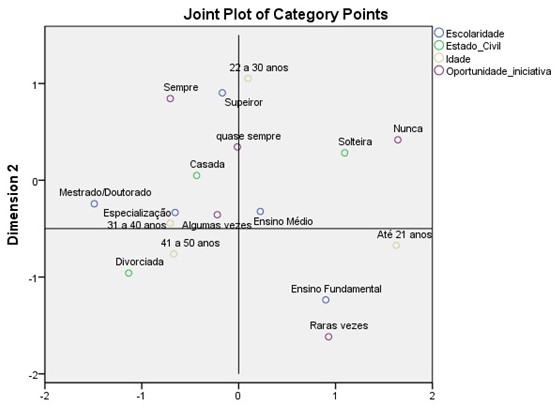 O Gráfico 1 apresenta a análise de correspondência das variáveis de pesquisa escolaridade, estado civil e faixa etária com a competência empreendedora Busca de Oportunidade e Iniciativa. A interpretação do Gráfico 1 esclarece que a competência “Busca de Oportunidade” e “Iniciativa” tem maior correspondência com as mulheres de faixa etária entre 22 e 30 anos, curso superior completo e preponderantemente casadas. Em mulheres que administram um negócio familiar, a busca pela realização pessoal e sonhos estão atrelados ao crescimento profissional e empresarial, satisfazendo-os por meio de dedicação, perseverança e planejamento (GRZYBOVSKI; BOSCARIN; MIGOTT, 2002).