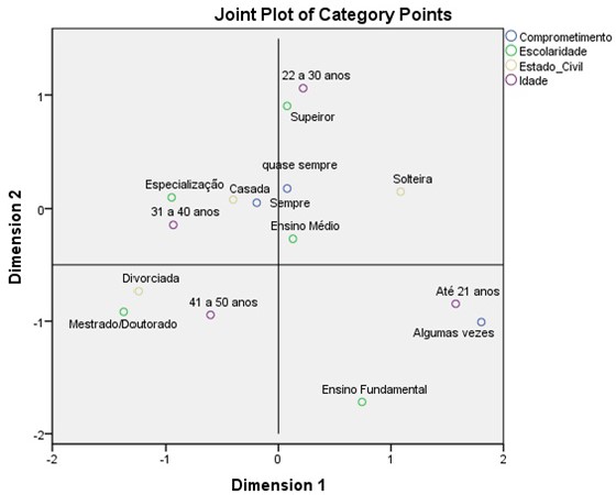 Neste estudo, a análise de correspondência se deu a partir das variáveis relacionadas na primeira parte do formulário: faixa etária, escolaridade e estado civil. As competências empreendedoras foram relacionadas a tais variáveis de pesquisa. A exposição dos gráficos na análise dos resultados teve como critério as correspondências de maior significância ao objetivo proposto nesta investigação.
