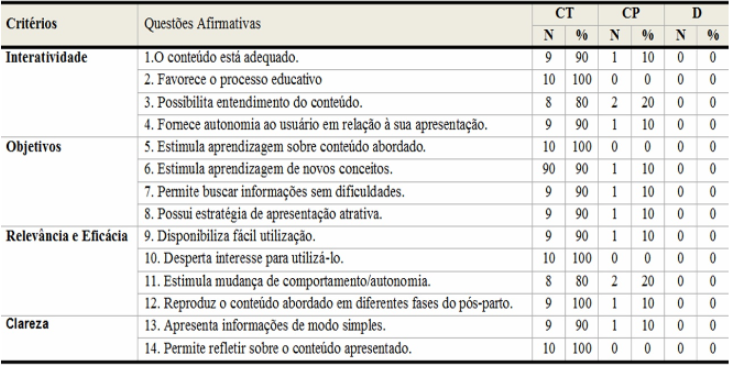 Após a estruturação do material educativo, este foi encaminhado às especialistas e puérperas para apropriação e avaliação, em que se obtiveram os dados conforme critérios de Pasquali, segundo Tabela 1.