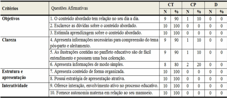 Com relação ao olhar das puérperas, conforme Tabela 2, todos os critérios superaram a média-alvo de 50%, ficando entre 80 a 100% CT. Somente a afirmativa “Apresenta informações de modo simples” atingiu 80% de CT e demais 20% com CP. Sendo assim, com um índice de concordância total satisfatório, pode-se indicar que o material educativo proposto é uma ferramenta eficaz no processo ensino (enfermeiro) e aprendizagem (puérperas), a partir da educação em saúde desenvolvida sobre o pós-parto e aleitamento materno.