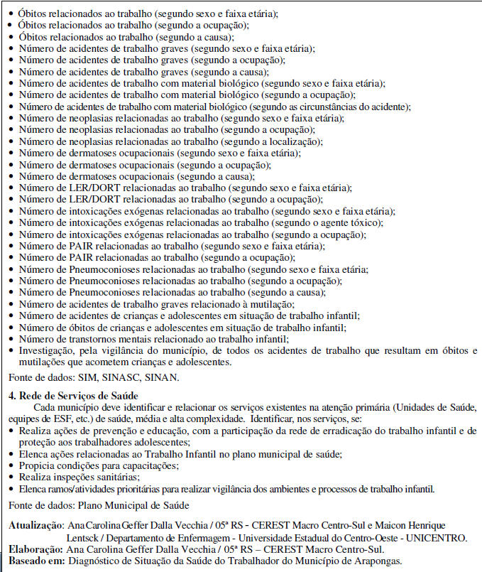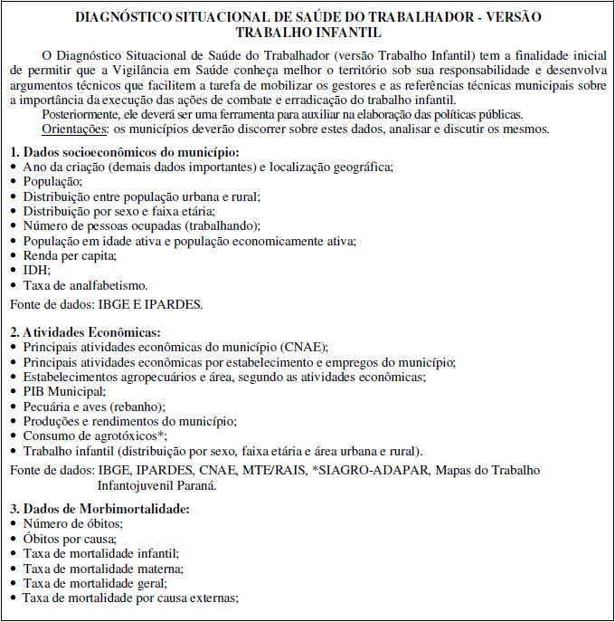Para a investigação da realidade regional acerca do problema, foi elaborado um instrumento referente ao diagnóstico situacional do trabalho infantil (Quadro 1), a partir de roteiro para identificação da saúde do trabalhador da 5ª Regional de Saúde (DALLA VECCHIA, 2014).