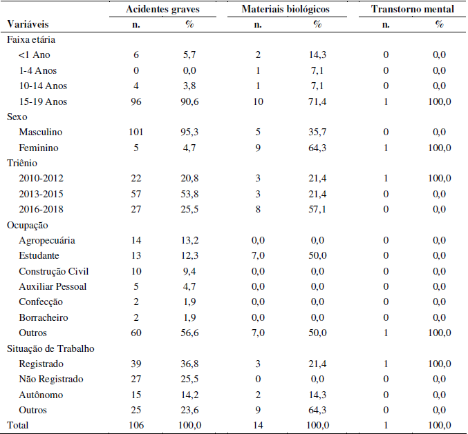A incidência de acidentes graves de trabalho entre crianças e adolescentes foi maior na faixa etária de 15 a 19 anos. A maior parte dos casos se refere a trabalhos agropecuários, seguido pela construção civil. Observou-se ainda a ocorrência de casos de acidentes com materiais biológicos. A maioria dos acidentes ocorreu com o sexo masculino. Eram estudantes que possuíam registro em carteira de trabalho.