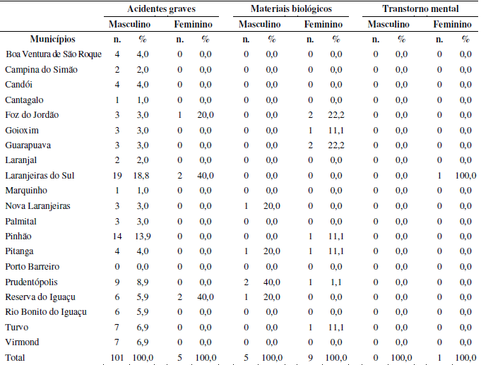 A tabela 2 apresenta os números de incidência de casos de acidentes, segundo o município e sexo. A maioria dos casos se referem aos acidentes graves (101), sobretudo em Laranjeiras do Sul (21) e Pinhão (14). Os casos notificados de acidentes que envolveram materiais biológicos totalizaram 14 e de transtorno mental, 1 caso em Laranjeiras do Sul, sendo o indivíduo do sexo feminino (Tabela 2).