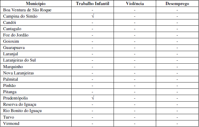 O Quadro 2 demonstra os municípios que contemplam em seus planos municipais de saúde ações e metas sobre o trabalho infantil. Apenas os municípios de Campina do Simão e Prudentópolis descreveram ações no âmbito da 5º Regional de Saúde do Estado do Paraná.