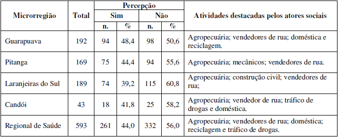 O Quadro 3 apresenta dados das 4 microrregiões da regional de saúde, quanto à percepção de gestores e atores sociais em relação ao trabalho infantil. Na Regional de Saúde, 44% dos entrevistados identificaram o trabalho infantil em seus municípios em atividades de agropecuária, vendedores de rua, domésticas, reciclagem e tráfico de drogas. Essas atividades são as mais percebidas pelos atores sociais. A maior percepção foi observada pelos atores sociais da microrregião de Guarapuava (48,4%). Em contraponto, a microrregião de Laranjeiras do Sul apresentou a menor percepção de trabalho infantil (39,2%).