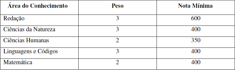 Particularmente, a UNIFAL-MG dispõe de um termo de adesão ao SISU que estabelece as notas mínimas necessárias para concorrer às vagas dos cursos de graduação e os pesos para cada área do conhecimento, ambos com base nos resultados obtidos no ENEM. A Tabela 1 exibe estes dados: