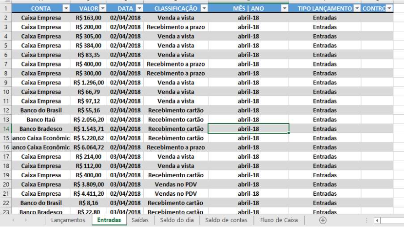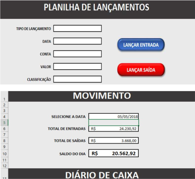 A figura 1 ilustra a planilha relacionada ao lançamento de entradas e saídas de caixa.