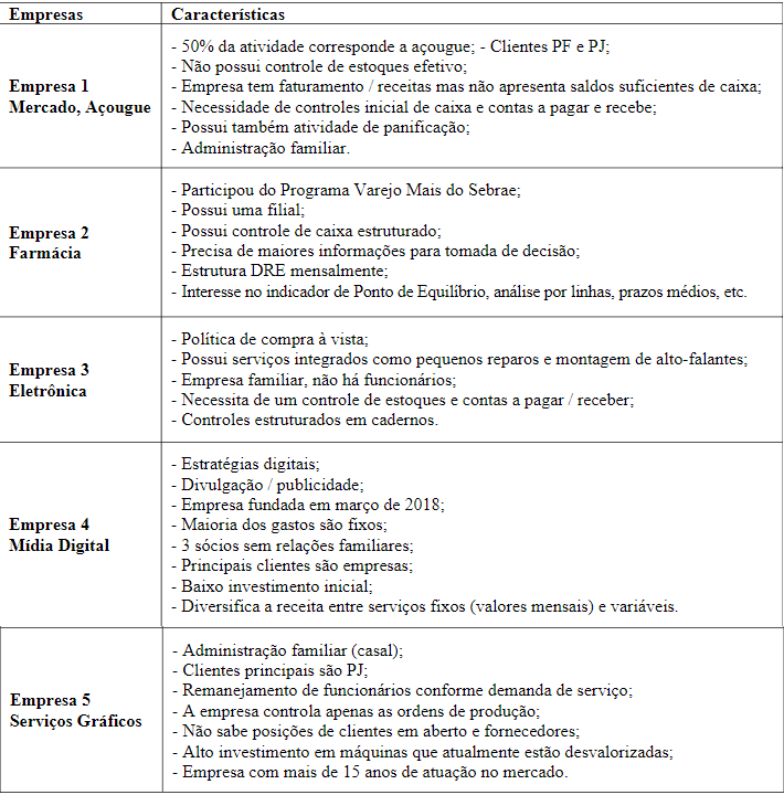 Apenas a empresa 4 está enquadrada, tributariamente, sob a forma de microempreendedor individual, sendo que as demais organizações fazem parte do regime tributário do Simples Nacional, sob a classificação de microempresa. Destaca-se, ainda, para todas as empresas, que a gestão direta cabe aos sócios e que não há muita delegação de funções financeiras para funcionários especializados. Apenas a empresa 2 possui e mantém um departamento financeiro com funcionário exclusivo para desempenhar tal função.