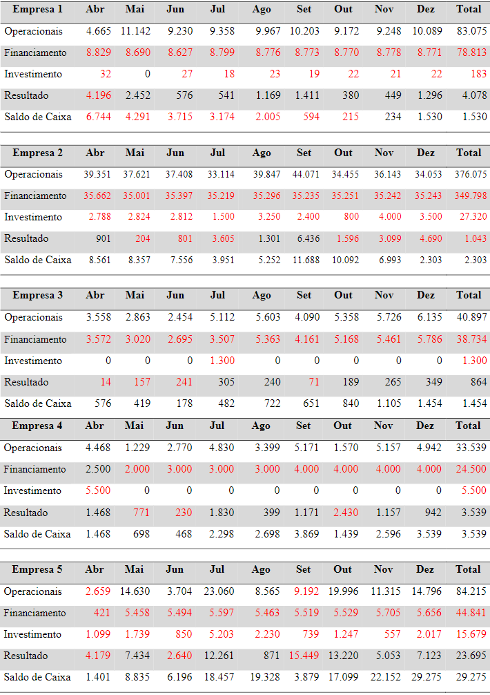 A empresa 5, apesar de possuir um maior saldo final de caixa em comparação com os ingressos brutos de caixa, enfrenta problema recorrente de sazonalidade. Tal problema tem origem nos contratos com órgão públicos. Desse modo, a empresa não depende apenas da finalização de seus serviços, mas conta com a finalização do empenho por parte dos contratantes. Isso acarreta em alta variabilidade de resultado de caixa nas atividades operacionais.