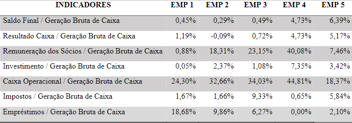 A maior remuneração para os sócios é percebida nas empresas 2, 3 e 4. A empresa 2, apesar de possuir pagamentos de empréstimos, também possui alta margem de lucro e um departamento financeiro bem estruturado, fato este que certamente contribui para que a empresa destine 18,31% das entradas de caixa para os sócios. As empresas 3 e 4 trabalham com serviços que possuem maior valor agregado, desse modo, permitem aliar uma alta margem de lucro à baixa dependência de empréstimos. Sendo assim, os valores distribuídos aos sócios respondem, no ano de 2018, a 23,15% e 40,08% dos recursos financeiros conseguidos, respectivamente.