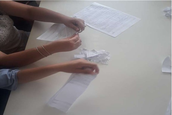 Como primeiro passo da produção do “Papel Semente”, cada grupo recebeu papéis que deveriam ser picados para posteriormente serem molhados e triturados (Figura 1).