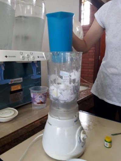 Na segunda etapa da atividade, os papéis já picados foram mergulhados na água e triturados no liquidificador por 30 segundos, tempo suficiente para que a consistência do papel se tornasse pastosa, formando a polpa de papel (Figura 2). Nesse momento, os alunos puderam colorir as polpas de papel através de corantes, o que posteriormente dará cor ao seu “Papel Semente”.