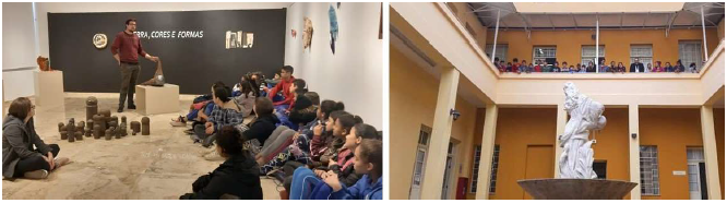 A mediação dos estagiários e acadêmicos do curso de Artes Visuais, dentro das estratégias de ensino, pesquisa e extensão, trouxe aos alunos a oportunidade de conhecer um pouco da História do prédio da Proex, onde os eventos são promovidos e qual a função deste setor para com a comunidade. Os alunos da escola pública visitaram a Exposição Terra, cores e formas (Figura 5), que encantou aos olhos de um público que, pela primeira vez, esteve presente em uma Galeria de Arte, podendo assim compreender e vivenciar as relações que a Arte pode promover na formação do indivíduo.