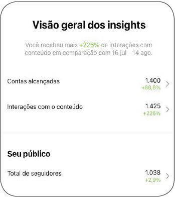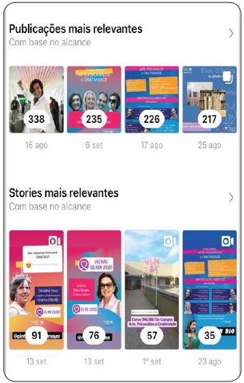 Sobre o engajamento no Instagram, os dados relacionados aos destaques recentes da página da Universidade da Criativa Idade revelam aumento no número de contas alcançadas (Figura 01). Em um universo de 1.400 contas alcançadas no período 15 agosto - 13 setembro, as quantidades (em percentagens), comparado ao período anterior de 16 julho - 14 agosto, observou-se um aumento de +2,9% de novos seguidores, 86,6% de alcance e +226% interações. Logo, pode-se afirmar que todas as ações estratégicas aplicadas na criação de conteúdos proporcionaram o aumento no número de visualizações e no total de seguidores.