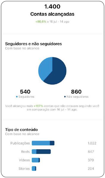 A métrica Contas Alcançadas (figura 2) mostra que a maior quantidade de não seguidores visualizam a página. Deve-se ter atenção a esse dado de 860 não seguidores em relação a 560 seguidores do perfil, pois estes views podem ser tanto de compartilhamentos quanto a captação de views pelo feed da ferramenta explorar, que entrega certos conteúdos a possíveis interessados usando como critérios a combinação de algoritmos próprios da redes social e também pelo uso das hashtags, ou seja, filtros que direcionam as publicações, por isso a importância desse mecanismo para obter maior alcance em publicações em qualquer tipo de mídia dentro do aplicativo. Observa-se que o maior alcance veio das publicações no feed, no total, as publicações tiveram 1.022 visualizações únicas. O segundo tipo de mídia mais visto foi o reels, tendo um alcance de 874 visualizações. Já os demais conteúdos de vídeos (IGTV e ao vivo) tiveram 370 visualizações dentro do período. O stories obteve durante o período avaliado 204 visualizações, sendo o tipo de mídia com o menor alcance.