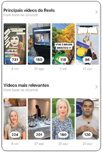 Na análise de alcance de vídeos e reels (figura 4), nota-se uma taxa regular em ambas categorias, sendo os vídeos a conteúdos de maior alcance, com 224 visualizações em 8 de setembro; 201 visualizações em 27 de agosto; 160 visualizações em 25 de agosto; e 120 visualizações em 20 de agosto, totalizando 705 visualizações em vídeos em destaque no período. Em relação aos reels, observa-se também uma taxa regular, porém um pouco menor que a dos vídeos. Com exceção de um reels que faz um convite ao evento de arte, psicanálise e criatividade, no reels percebe-se uso de um filtro de reconhecimento facial, que interage com o quadro de Jacqueline Kennedy, fazendo a imagem ter olhos maiores e sorrir, além de várias marcações de perfis de outros usuários por stickers próprios do stories, uso de gifs, e aplicação de uma imagem estática sobre o vídeo.