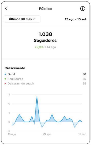 Sobre a métrica Total de Seguidores, os dados revelam que a página da Universidade da Criativa Idade obteve saldo positivo relacionando a quantidade novos seguidores e pessoas que deixaram de seguir, alta de 2,9% em relação ao mesmo período anterior. O crescimento geral, ou o número efetivo, foi de 30 novos seguidores, sendo que 55 seguidores recentes, e perda de 25 usuários que deixaram de seguir o perfil no período de 15 agosto - 12 setembro (figura 05).