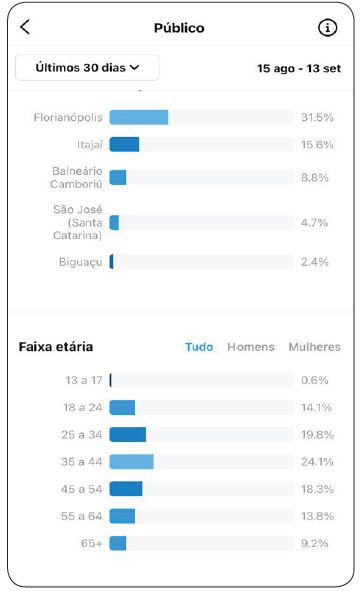 Na figura 06, observa-se que as cidades em que o Instagram do Criativa Idade obteve uma maior representatividade na mídia social estão, em suma maioria, concentradas no Estado de Santa Catarina, sendo que capital, Florianópolis, figura em primeiro lugar na lista de cidades com maior número de usuários, correspondendo a 31,5% do total; em segundo a cidade Itajaí com 15,6%; em seguida 8,8% da cidade de Balneário Camboriú; 4,7% da cidade de São José; e 2,4% da cidade de Biguaçu. Ainda na mesma seção é possível observar dados sobre segmentação de gênero (masculino e feminino) e também classificação por faixa etária.