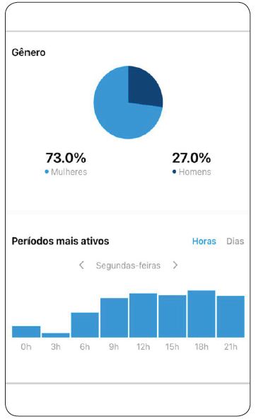 Na figura 07, tem-se os dados sobre o total de seguidores. Notou-se a predominância do público feminino entre os seguidores da Criativa Idade, com mais 73% de usuários de mulheres e 27% de homens, além disso, percebeu-se que o horário preferido para interação compreende entre 9h e 21h, e a segunda-feira representou o melhor dia.