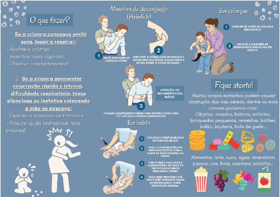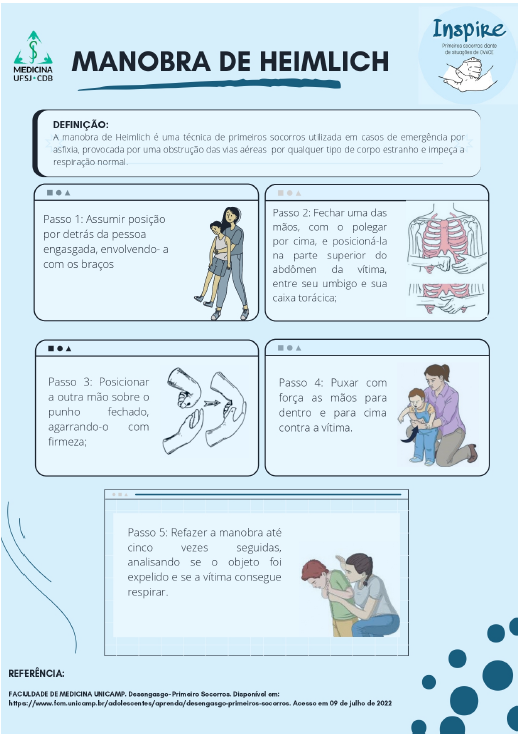 Por fim, em relação ao eixo de comunicação, o projeto “Inspire” trabalhou com a produção de dois tipos de materiais gráficos: (1) banners com o passo a passo das manobras de desobstrução, para uso e exposição contínua nos espaços escolares; (2) cartilhas informativas para distribuição comunitária (família dos alunos)1.