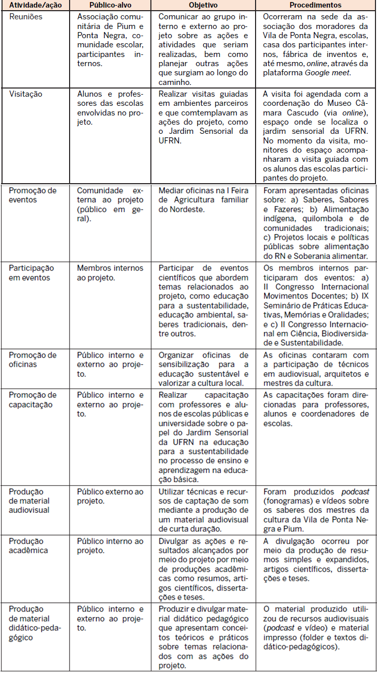 O projeto ocorreu entre dezembro de 2021 e julho de 2023, abrangendo atividades diversas, como: reuniões, visitação, promoção de eventos, participação em eventos, promoção de oficinas, produção de material audiovisual, capacitação, produção acadêmica (artigos científicos, dissertações e teses) e produção didático-pedagógico (Quadro 1).