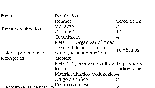 Fonte: Dados da pesquisa (2023).Os dados evidenciam que o projeto obteve resultados satisfatórios ao apontar o alcance das duas metas inicialmente traçadas (e inseridas no seu objetivo principal), além do alcance de resultados paralelos a tais metas. Considera-se, portanto, que a articulação entre a Educação para a Sustentabilidade nas escolas e os saberes tradicionais dos moradores das comunidades participantes foram essenciais para a tomada de consciência sobre o papel que o ser humano possui frente aos princípios da sustentabilidade. Além disso, fica evidente a realização de movimentos, por meio de ações e atividades que engajaram a comunidade na busca por um convívio sustentável com o meio, tomando a educação como uma vertente fundamental para isso.