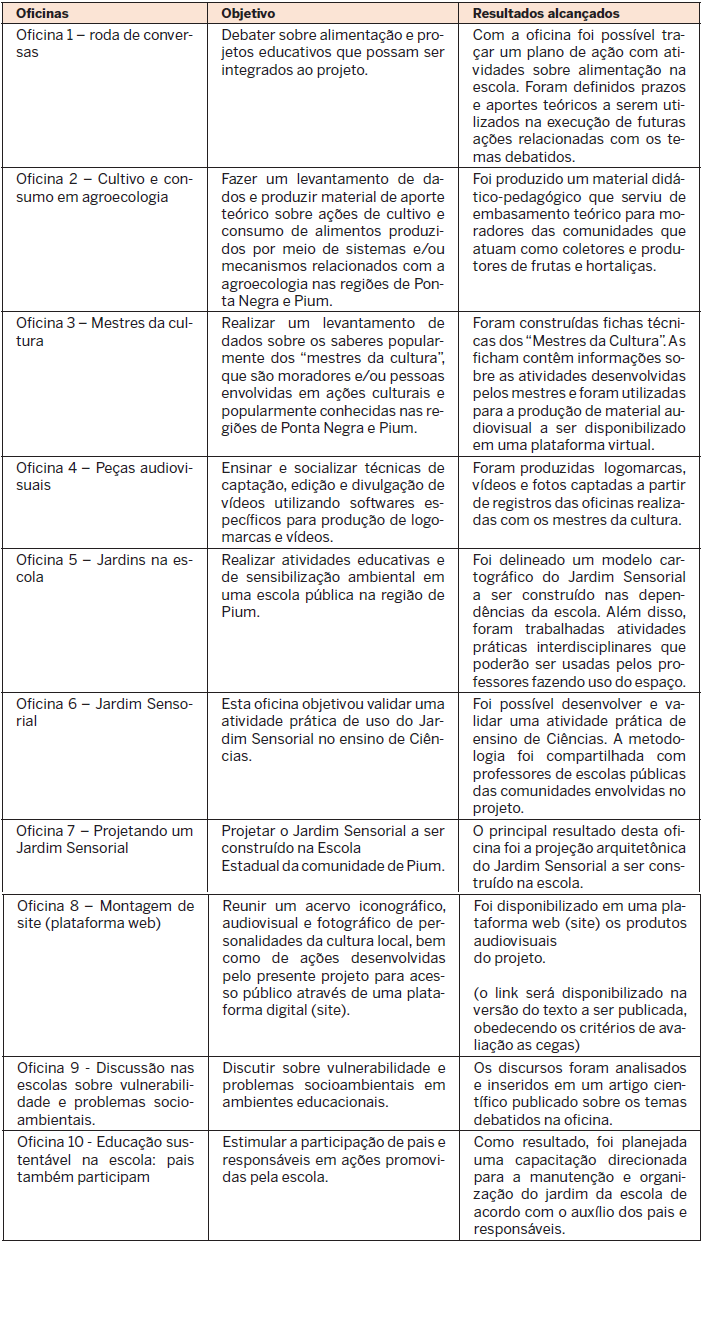 Com a meta direcionada para a organização de oficinas de sensibilização para a educação sustentável nas escolas (Meta 1) foram desenvolvidas 10 oficinas (Quadro 3). Essas oficinas foram direcionadas para participantes internos e externos ao projeto, mas que, de alguma forma, estão ligados com a comunidade de Pium e Ponta Negra, por meio de ações culturais, sociais e/ou educacionais. Assim, as oficinas contaram com ampla participação de público e os resultados obtidos atenderam as dimensões da Educação para a Sustentabilidade, visto envolverem aspectos sociais, ambientais e econômicos.