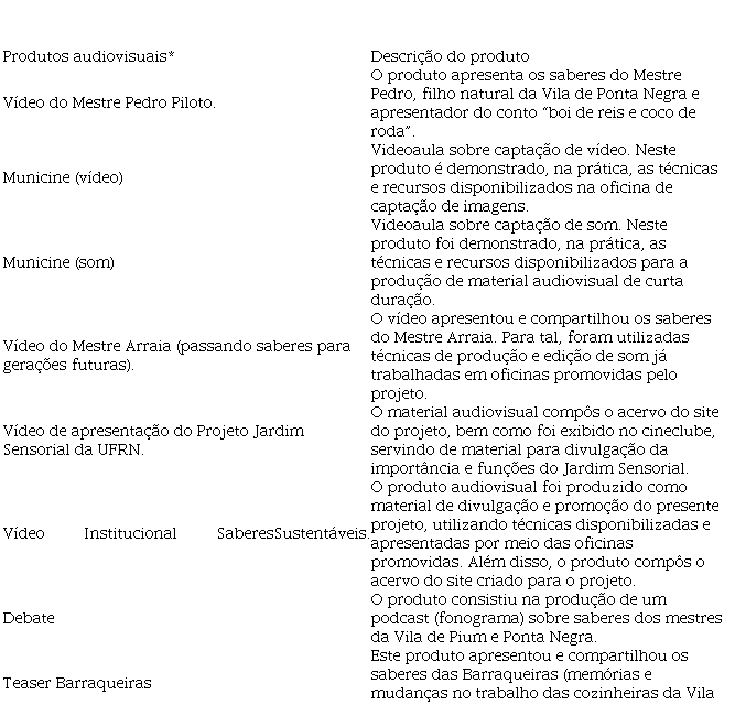 Nessa perspectiva, por meio da realização de trabalhos como: - As barraqueiras: memórias e mudanças no trabalho das cozinheiras da Vila de ponta Negra; - O Jardim Sensorial como espaço de formação científica e inclusão na perspectiva da Educação para a Sustentabilidade; - Autonomia de mulheres das escolas campesinas de agroecologia; - O Jardim Sensorial como espaço não formal de ensino para a mitigação da cegueira botânica; - A pandemia de Covid-19 e o setor artesanal do Rio Grande do Norte, dentre outros, foi possível mergulhar em temáticas pertinentes e que extrapolaram as barreiras do presente projeto. Isso propiciou maior visibilidade para os saberes tradicionais e científicos que se relacionam com as comunidades envolvidas neste estudo, possibilitando maior contribuição e retorno para a comunidade acadêmica e cultural a nível local, regional, nacional e mundial.