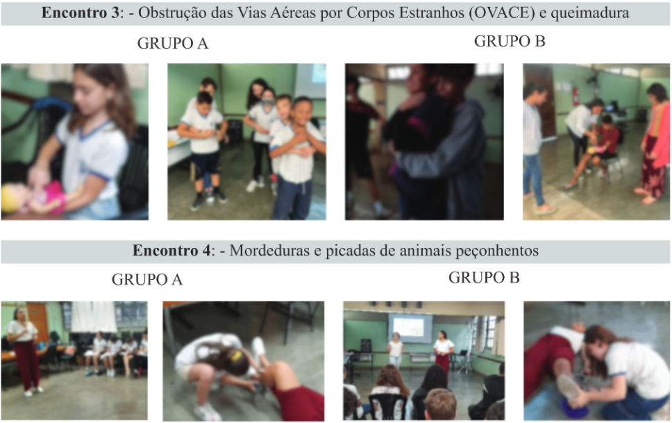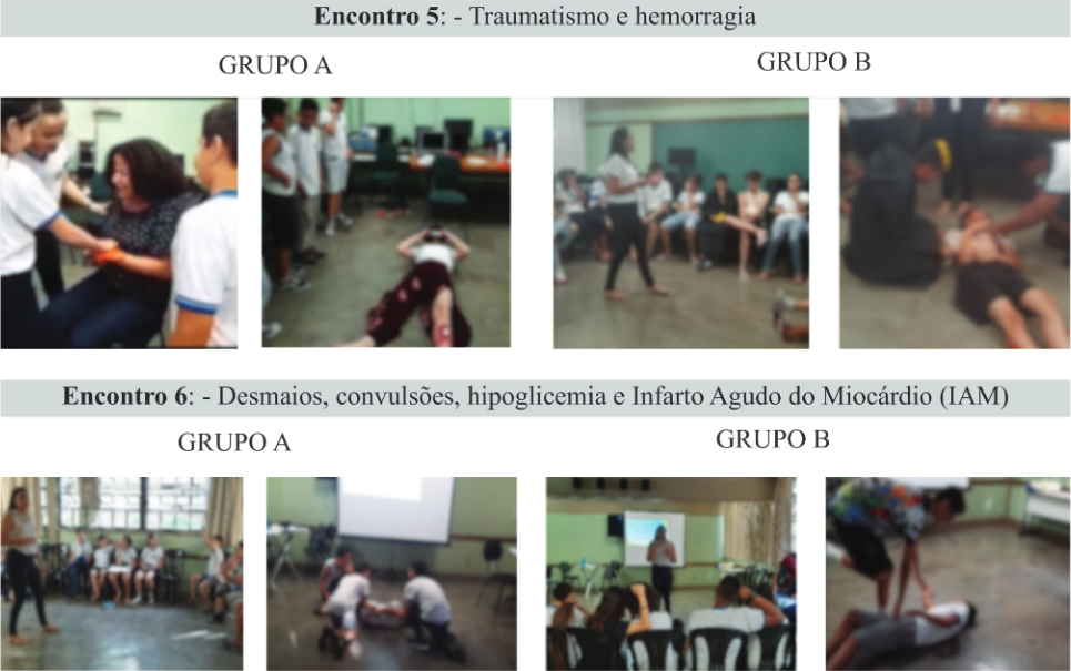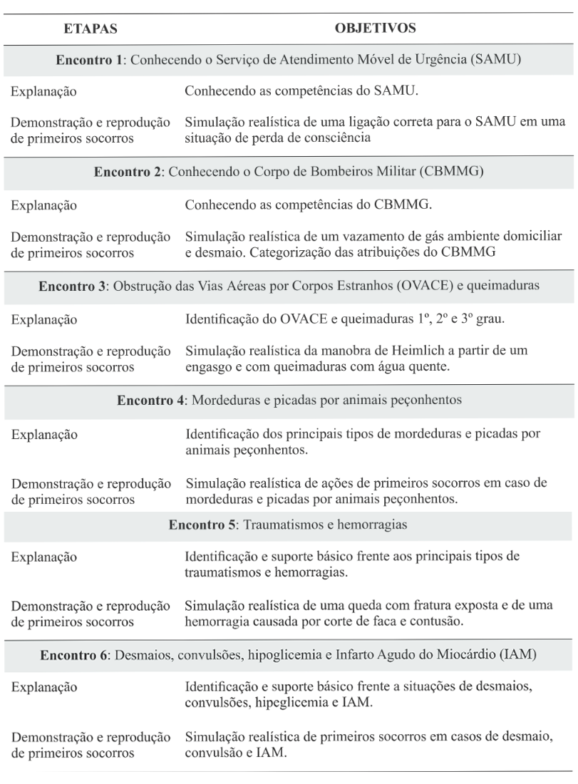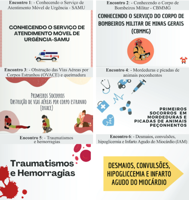 Os dois grupos passaram pela experiência dos seis encontros a partir das temáticas: i) conhecendo o Serviço de Atendimento Móvel de Urgência (SAMU); ii) conhecendo o Corpo de Bombeiros Militar; iii) Obstrução das Vias Aéreas por Corpos Estranhos (OVACE) e queimadura; iv) mordeduras e picadas de animais peçonhentos; v) traumatismos, hemorragias, desmaios e convulsões, e, vi) distúrbios glicêmicos e Infarto Agudo do Miocárdio (Figura 1).