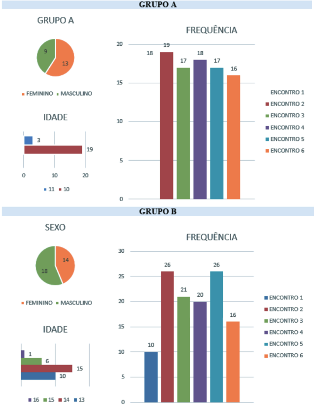 Após a realização dos encontros, verificou-se que o grupo A (crianças) teve maior adesão, com média de 18 participantes por encontro, enquanto o grupo B (adolescentes) teve média de 20 participantes por encontro. Com relação ao sexo, o feminino predominou no grupo A, com 59%, e o masculino no grupo B, com 56%; e, ainda, as faixas etárias mais prevalentes foram as de crianças com 10 anos de idade (86%) e adolescentes com 14 anos (47%) (Figura 2).