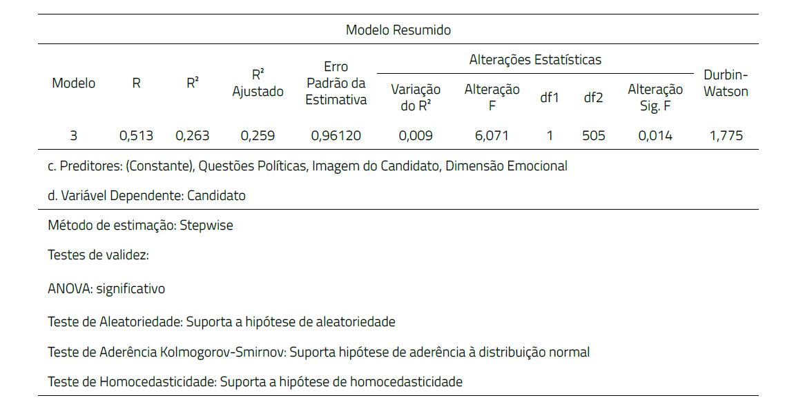 Já os domínios imaginário social (características demográficas, crescimento socioeconômico, projeto cultural, reforma política e perfil ideológico), eventos atuais (inflação, corrupção e gestão pública), eventos pessoais (ética, moral e religião, mentira e crime) e questões epistemológicas (mudança, mídia e partido político) não foram mencionados no modelo por não terem sido significativos quanto à previsão da variável dependente do estudo (candidato). Ou seja, de acordo com o resultado da regressão, o imaginário social, os eventos atuais, os eventos pessoais e as questões epistemológicas não interferem na formação de opinião quando o assunto é a escolha do melhor candidato. Dessa forma, notou-se que quatro (H2, H5, H6 e H7) das sete hipóteses (H1, H2, H3, H4, H5, H6 e H7) propostas no estudo foram rejeitadas.
