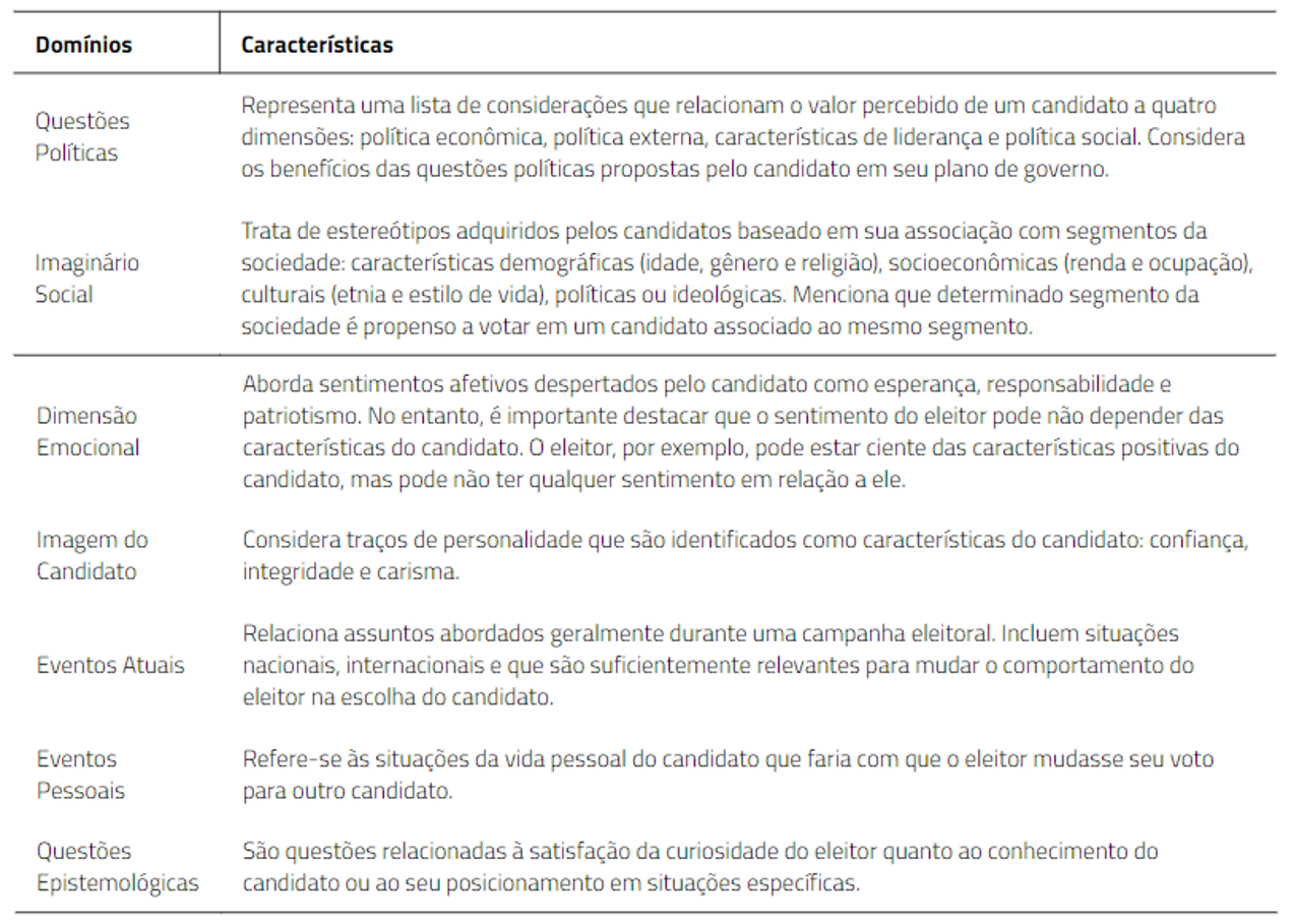 A análise do comportamento dos eleitores tem sido apresentada de diferentes formas, de acordo com estudos feitos por Cwalina, Falkowski, Newman e Vercic (2004), O’Cass e Pecotich (2005), Ben-Ur e Newman (2010) e Farrag e Shamma (2014), no entanto, apenas os elementos-chave do modelo de Newman e Sheth (1985) foram considerados para esta pesquisa. Os autores propuseram, por meio do modelo, que os sete domínios cognitivos distintos, relacionados na tabela 1, são independentes entre si e igualmente importantes para determinar a intenção de voto do eleitor.