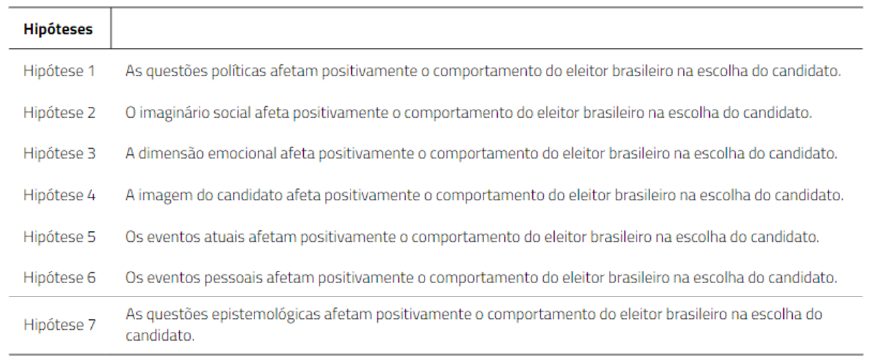 Diante da contribuição promovida por Newman e Sheth (1985), optou-se por considerar que cada hipótese de estudo proposta para esta pesquisa representa um domínio cognitivo conceituado pelos autores e descrito na tabela 1. Assim sendo, sete hipóteses foram consideradas para avaliar o comportamento do eleitor brasileiro e sua decisão de voto, conforme relacionado na tabela 2.