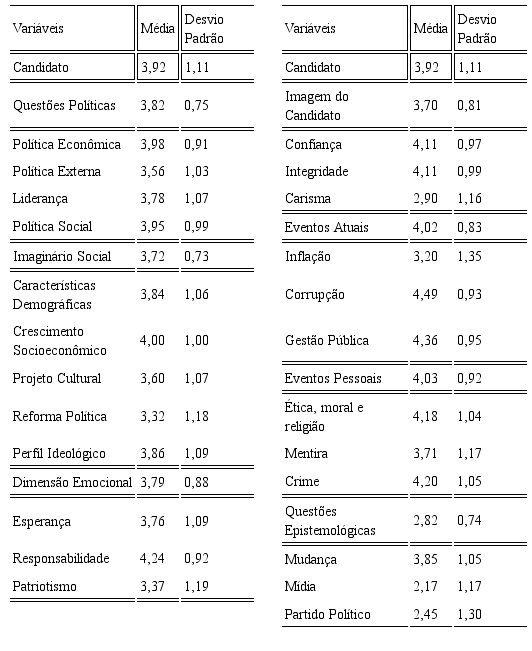 A estatística descritiva da amostra de 509 eleitores brasileiros pesquisados, apresentada na tabela 3, indica a média e o desvio padrão de respostas dos participantes quanto à variável dependente (candidato) do estudo, aos sete domínios (questões políticas, imaginário social, dimensão emocional, imagem do candidato, eventos atuais, eventos pessoais e questões epistemológicas) propostos por Newman e Sheth(1985) e às vinte e quatro afirmações que representaram as variáveis independentes pesquisadas e que definiram cada domínio: quatro afirmações relacionadas às questões políticas; cinco questões para o imaginário social e três questões para cada um dos demais domínios: dimensão emocional, imagem do candidato, eventos atuais, eventos pessoais e questões epistemológicas (NEWMAN; SHETH, 1985).