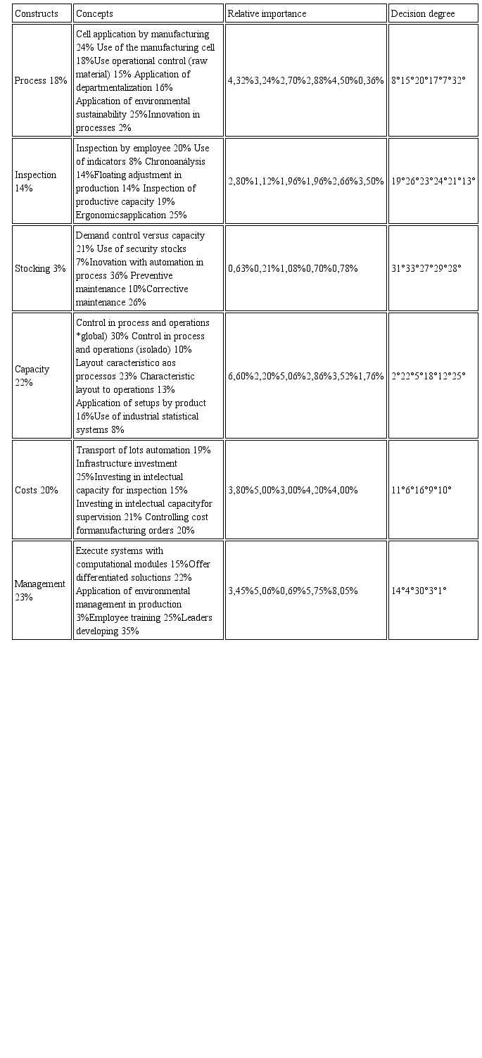 Decisions for any organizational environment involve many intangible situations that need to be studied. To understand these facts, these intangibilities need to be measured and tangibly evaluated in order to meet the goals of the decision maker (Saaty & Shih, 2009). In this way, in contrast to Table 4, two approaches can be argued as a result goes against the objective of this research. The first one is restricted to the constructs that, in terms of degree of importance, the managers considered management, costs and capacity as being more attention when it comes to decision making. That is, in terms of evaluation, the first steps to be structured and evaluated in a product systematization is the management construct with (23%). The subconstruct in focus is the development of leaders (35%). Many organizations consider this subconstruction as a key to good organizational management (Elassy, 2015). Capacity with (22%) has as its operational highlight control in processes and operations (30%). In the construct costs (20%) carry out in investments in infrastructure got the most importance with (25%).