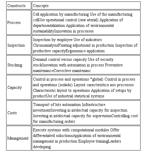 As a method of searching for data, a questionnaire was applied in an interview with first-line production and quality specialists. As a method of data selection, questionnaires of a colloquial nature were applied to managers and specialists of the first line of production and quality. Thus, we have related the constructs (Appendix A) to be used, described in published literature: processes, inspection, storage, capacity, costs and management. This set of indicated criteria was referenced with theoretical basis in articles that directly potentiate the use of these factors and proposed openness to elaborate the sub-constructs. Moreover, we followed the below procedures: