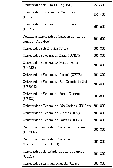 O ranking da Times Higher Education foi escolhido por ser uma classificação estável (USHER, 2015) que posiciona boas universidades de todo o globo por seu desempenho em ensino, pesquisa, transferência de conhecimento e perspectiva internacional. No resultado da avaliação 2015-2016 deste ranking dezessete universidades brasileiras fazem parte de uma lista que cita 800 instituições de ensino superior mundiais. As universidades listadas no ranking estão expostas na Tabela 1, com seus nomes seguidos pela sua posição no ranking.