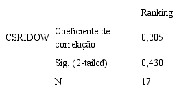 Para testar a hipótese que trata da correlação entre a comunicação de responsabilidade social (CSRIDOW) e o desempenho de universidades brasileiras no ranking da Times Higher Education, foi feita a análise de correlação de Pearson, cujos resultados estão visíveis na Tabela 2 logo a seguir.