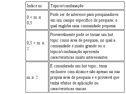 Com base nas definições propostas por Banks (2006), serão considerados hot topics as combinações com índice m ≥ 2. Já as combinações que obtiverem um índice m ≥ 2 serão considerados tópicos emergentes na área pesquisada.
