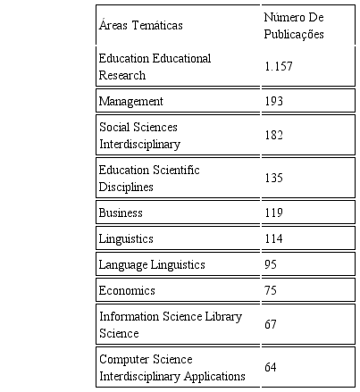Inicialmente, selecionaram-se as 10 áreas do conhecimento que possuem mais publicações a respeito da temática, apresentadas na Tabela 1.