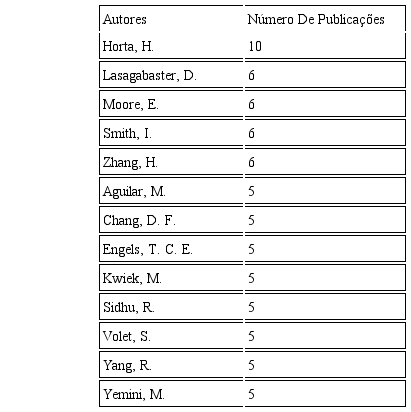 O autor que mais se destacou foi Hugo Horta com um total de 10 publicações, seguido dos demais autores com 6 e 5 publicações no referido tema. Horta, H. é professor assistente na Divisão de Administração de Políticas e Educação em Ciências Sociais da Faculdade de Educação da Universidade de Hong Kong. Ele trabalha com temas voltados para a diversidade do ensino superior, política científica e financiamento, produtividade de pesquisa, networking, internacionalização do ensino superior e mobilidade acadêmica.