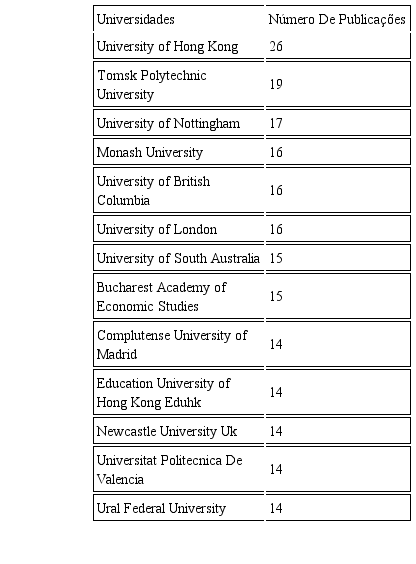 Quanto às instituições que mais publicaram sobre a temática no período estudado, com seus respectivos países de origem, destacam-se: University of Hong Kong – China (26), Tomsk Polytechnic University – Rússia (19), University of Nottingham – Inglaterra (17), Monash University – Austrália (16), University of British Columbia – Canadá (16), University of London – Inglaterra (16), University of South Australia – Austrália (15), Bucharest Academy of Economic Studies – Romenia (14), Complutense University of Madrid – Espanha (14), Education University of Hong Kong Eduhk – China (14), Newcastle University Uk – Inglaterra (14), Universitat Politecnica de Valencia – Espanha (14) e Ural Federal University – Rússia (14) .