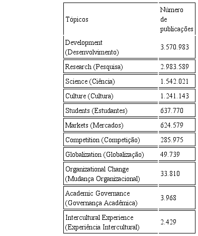 Após a etapa de verificar as principais características das publicações, foi realizada uma leitura dos resumos dos artigos mais citados para identificar os tópicos relevantes sobre internacionalização e universidade. Dessa forma, foram definidos 11 tópicos que mais se repetiam nos resumos, os quais foram pesquisados individualmente na Web of Science no período de 1989 até 2018, conforme estabelecido para a realização do presente estudo. Os tópicos selecionados estão apresentados na Tabela 4.