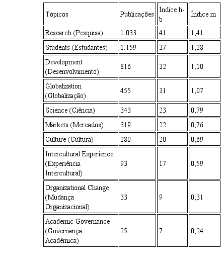 Na Tabela 5, citam-se os tópicos abordados na Tabela 4 combinados com os termos internationalization e university, no intervalo de 1989 a 2018. Dessa forma, foi identificado o índice h-b de cada um dos termos o que possibilitou a realização do cálculo do índice m.