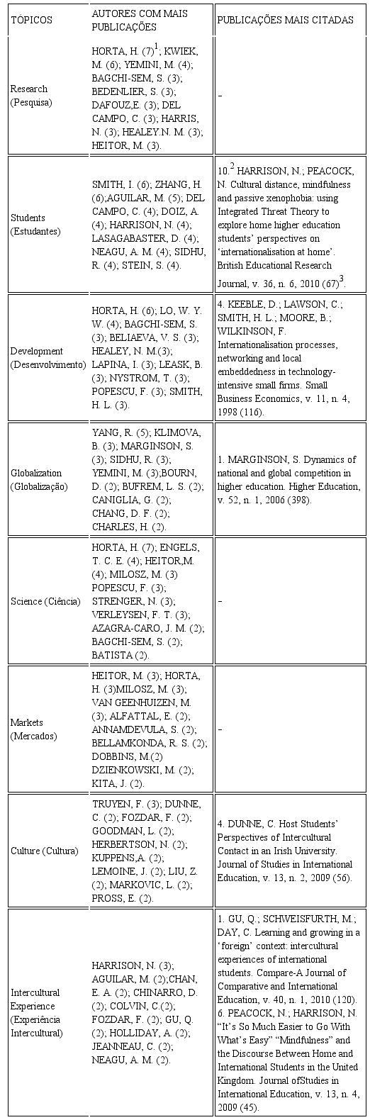 Os autores que mais publicaram sobre a temática conforme constam na Tabela (2), também estão identificados na Tabela (6) como sendo os autores que mais publicam no que diz respeito a combinação do termo internationalization e university com os tópicos considerados emergentes. Diante disso, foram identificados os tópicos que os autores mais pesquisam: Horta, H. (research, development, science e markets), LASAGABASTER, D., SMITH, I. (students e development), ZHANG, H. (students), AGUILAR, M. (students e intercultural experience), CHANG, D. F. (globalization), ENGELS, T. C. E. (science), KWIEK, M. (research), SIDHU,R. (students e globalization), YANG, R. (globalization), YEMINI, M. (research e globalization).